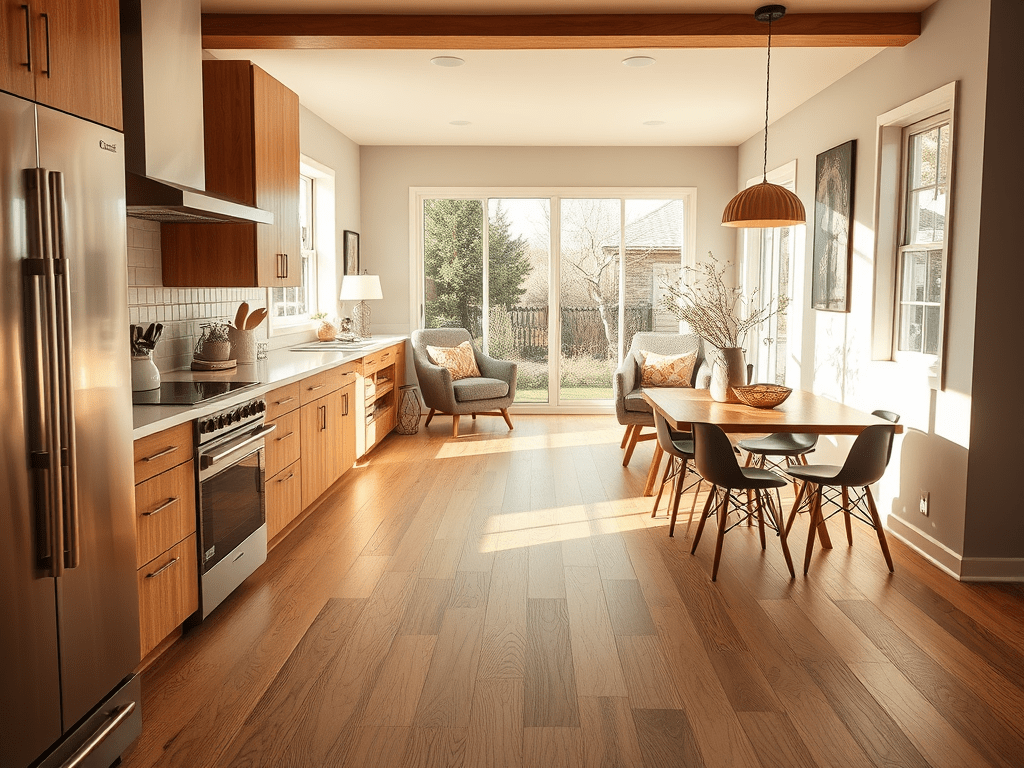 If you want that classic, warm, continuous wood look from your living area into the kitchen, consider engineered white oak. Maple is also a strong, real‑wood choice. If you want zero‑stress maintenance, wood‑look luxury vinyl plank or porcelain “wood” tile are worth considering as alternatives.